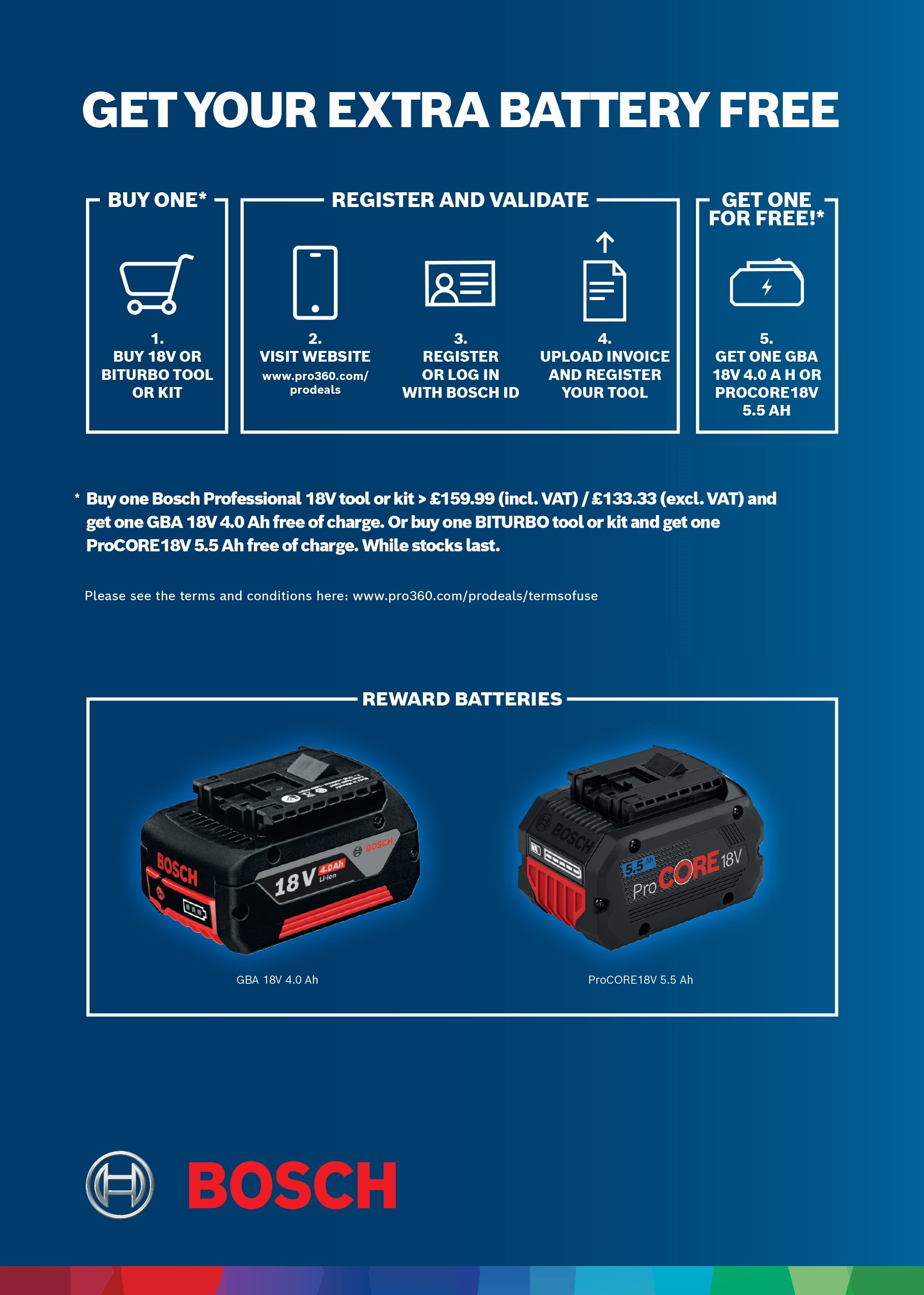 From 1 January Until 30th April 2021, you can buy one qualifying Bosch power tool and get a battery free!