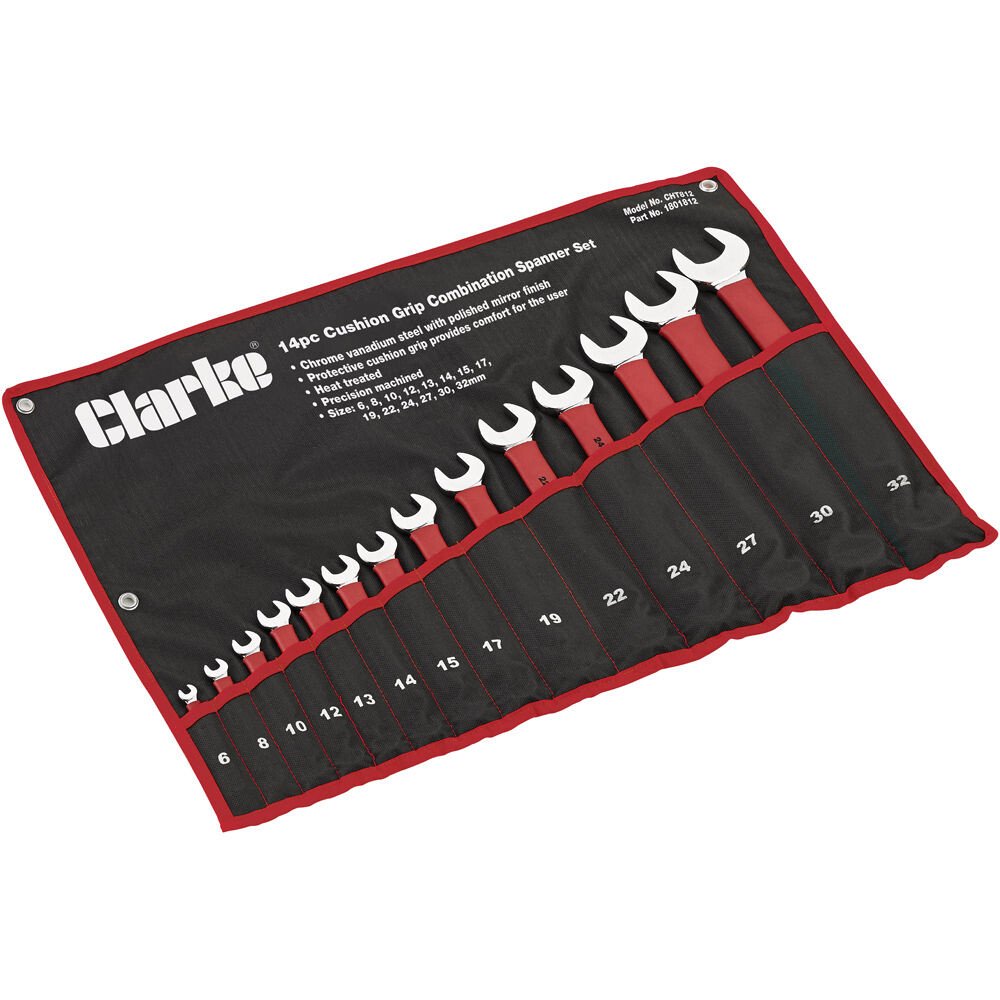- 14 Piece cushion grip combination spanner set: 6-32mm - Cushion grip for comfortable use and mirror polished finish that prevents oil and grease adhering to the surface
