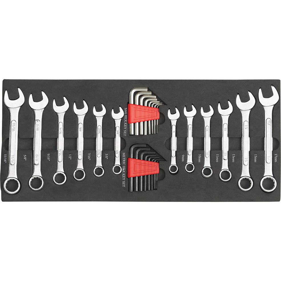 - 12 x Combination Wrenches: 9, 10, 11, 13, 15, 17mm & 3/8”, 7/16”, ½”, 9/16”, 5/8”, 11/16”.
