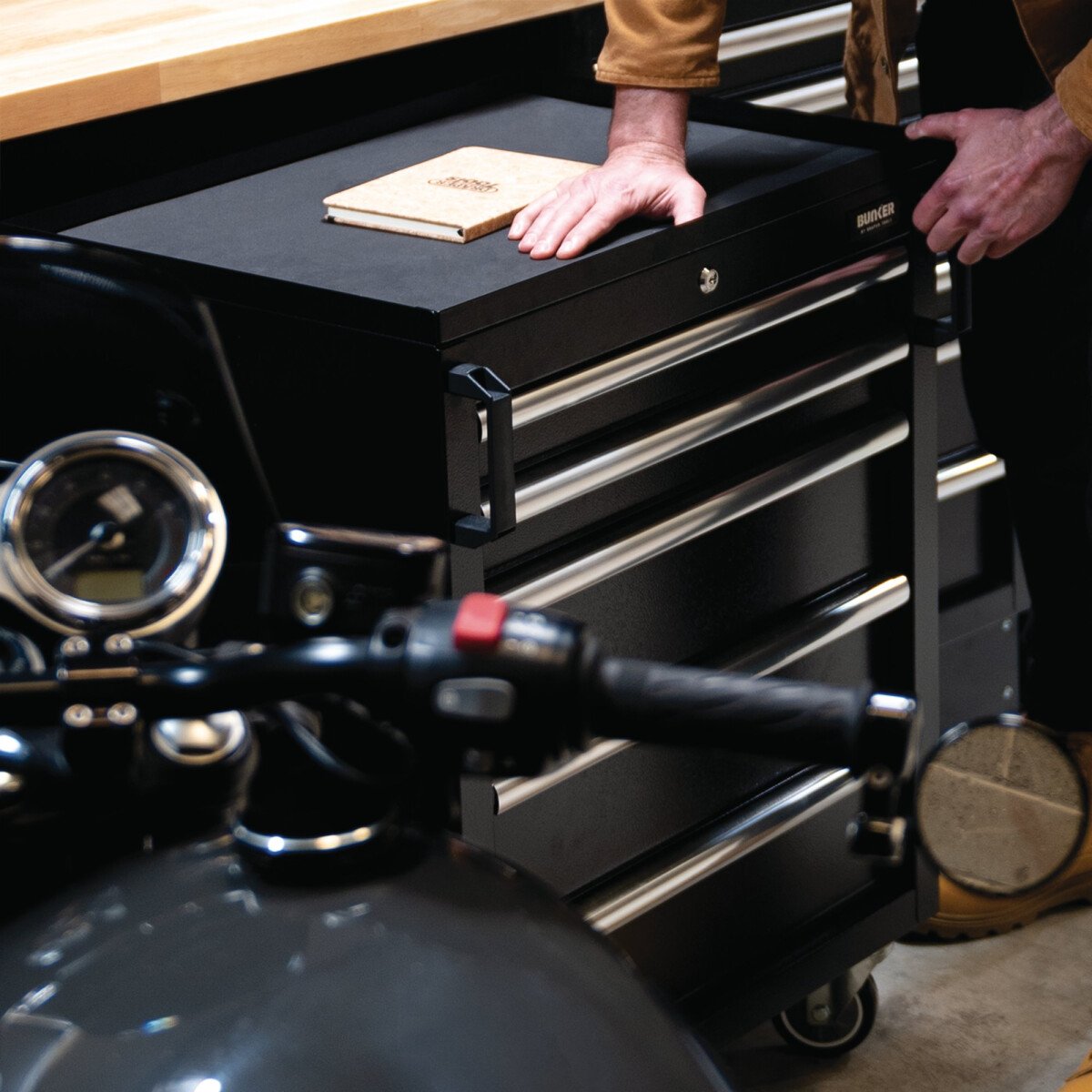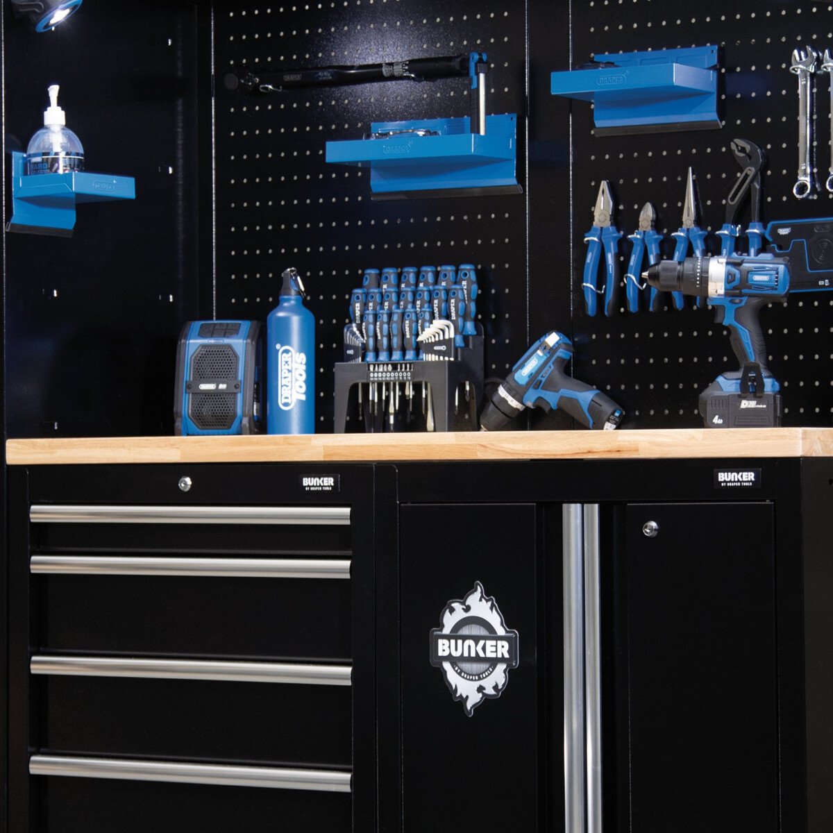 The floor cabinets are covered by a stylish hardwood worktop and provide incredibly versatile storage, featuring large cupboards with fully adjustable shelves and smooth soft-close drawers lined with lush foam to protect your tools.