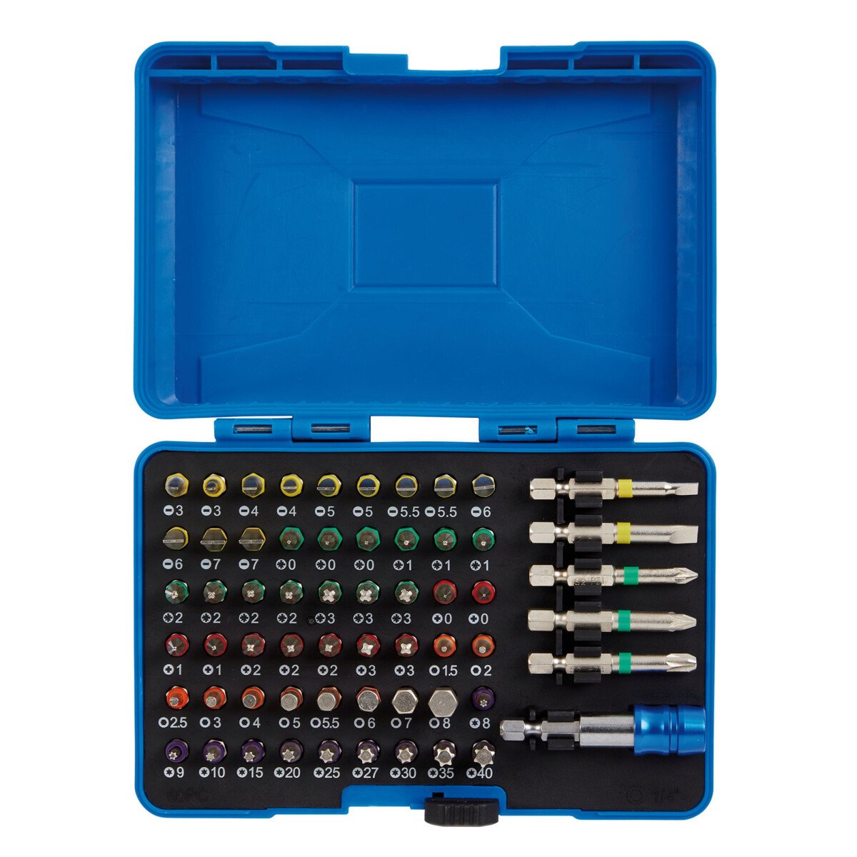 Each screwdriver bit is attached with a plastic coloured ring for easy identification.