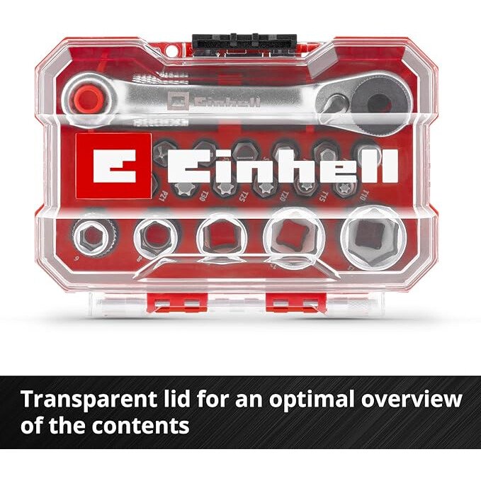 - The practical Einhell storage box not only serves as an organised storage space for all the components it contains, but also offers a robust auto-lock clip closure that ensures secure closing