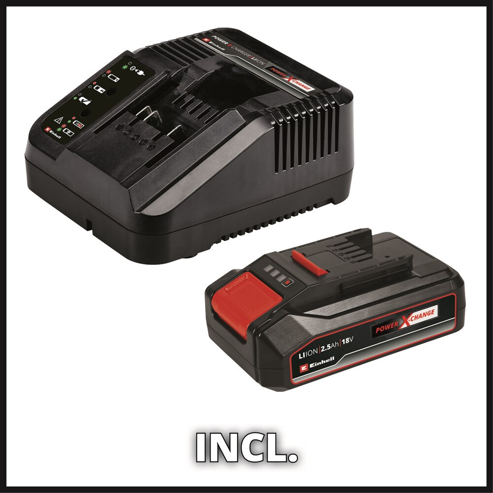 - Supplied complete with 1x 18V 2.5Ah battery and fast charger that is compatible with all Einhell Power X-Change batteries and tools