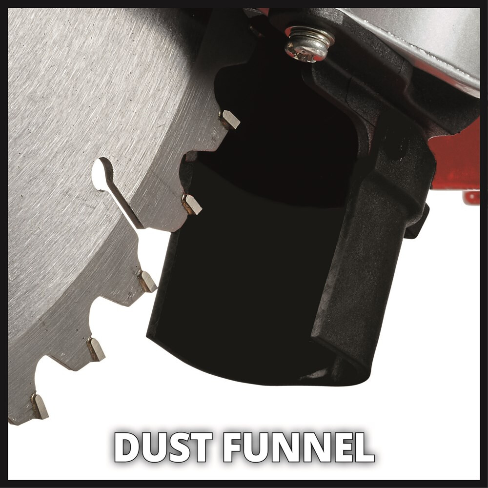 - The mains-powered laser is an big help when working and the dust funnel behind the saw blade removes the sawdust effectively