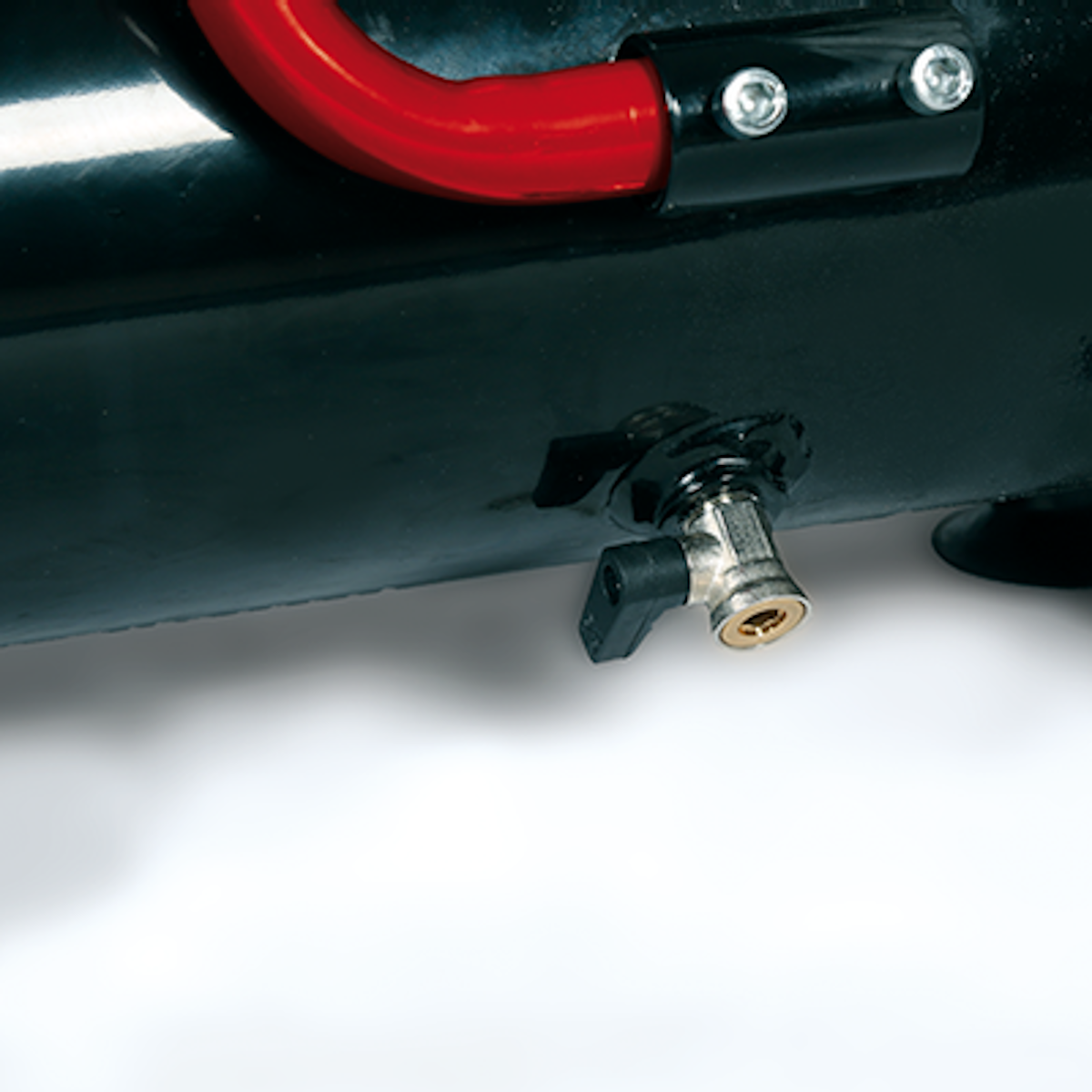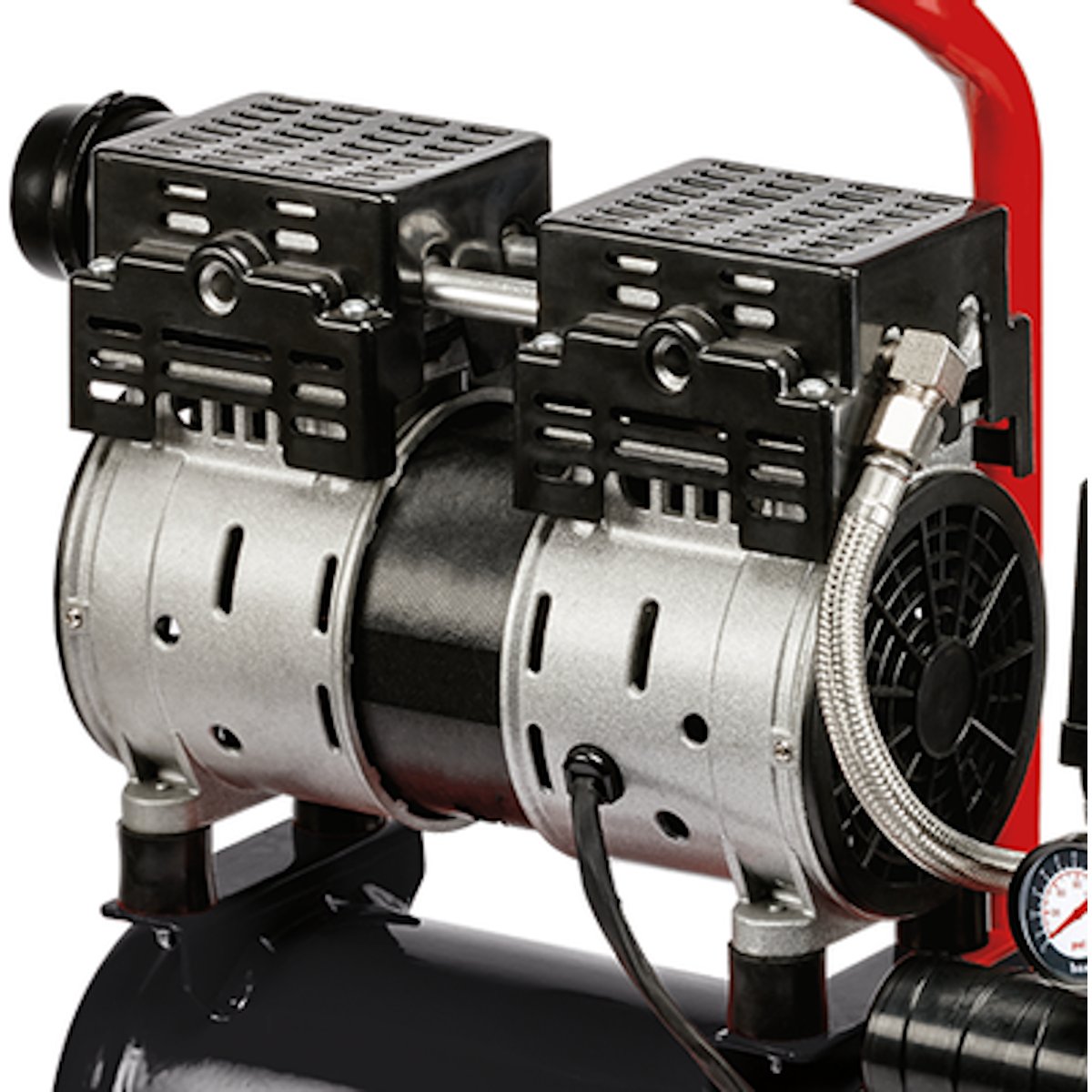 The Einhell compressor TE-AC 110/6 Silent Plus is a multifunctional item of basic equipment that has now arrived in the garage and workshed. One of the outstanding features of this compressor is that it generates less noise – a silent compressor with a 550 W rating, so it makes no compromises in power either. The 57 dB (LpA value) of this compressor makes it far quieter than standard compressors with comparable performance, and it has an oilfree and servicefree pump requiring just little maintenance. The drain cock on the compressor enables user-friendly maintenance. The mobile compressor has a 6 liter compressor tank – so, using the right tools to go with it, it has plenty of reserves for applying paint and lacquer in next to no time, or for applying preservative oil to wood either selectively or over a large area. You can also perform blow-cleaning or sand-blasting jobs in the workshed too. This allround helper effortlessly pumps up car, motorbike and cycle tires, as well as balls and air mattresses. Einhell is convinced of the quality and offers a ten year perforation corrosion warranty of the tank. There is a pressure reducer for regulating the numerous applications up to 8 bar. A pressure gauge and quick-release coupling for controlled working pressure are included. A safety valve protects the user. The low product weight and practical handle provide mobility - just a few steps and the compressor is ready for easy transportation, while stability during use is ensured by the vibration-absorbing legs.