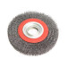 A crimped steel circular wire brush designed to be mounted on a bench grinder.
