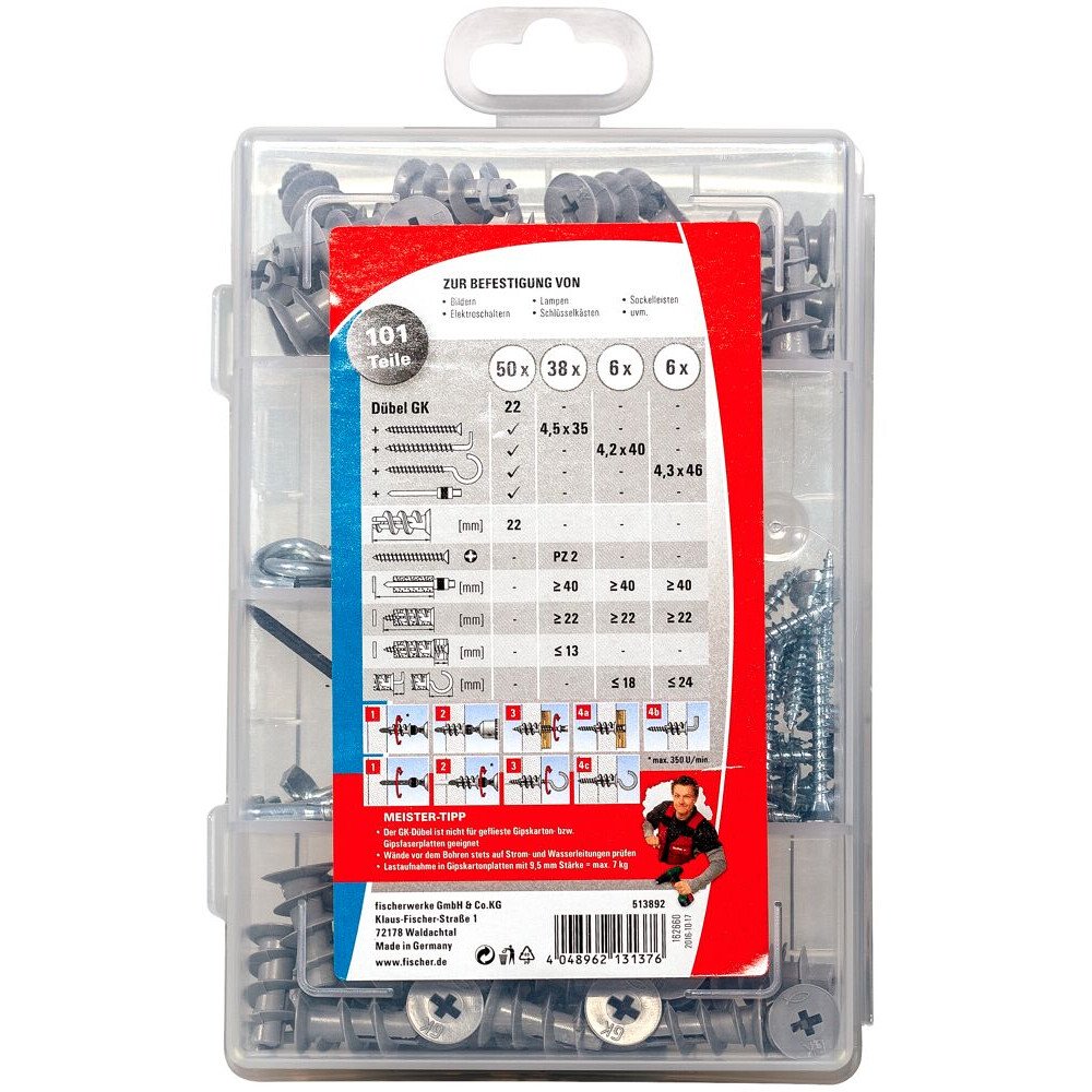 Contents 50 x Plasterboard fixing GK 1 x Setting tool 38 x Countersunk head screw 4.5 x 35 6 x Angle hook 4.2 x 40 6 x Round hook 4.0 x 46 Packaging Assortment box GTIN (EAN-Code) 4048962131376 Applications Pictures Lighting Electrical installations Fitting accessories Building materials Gypsum plasterboard, single and double-planked
