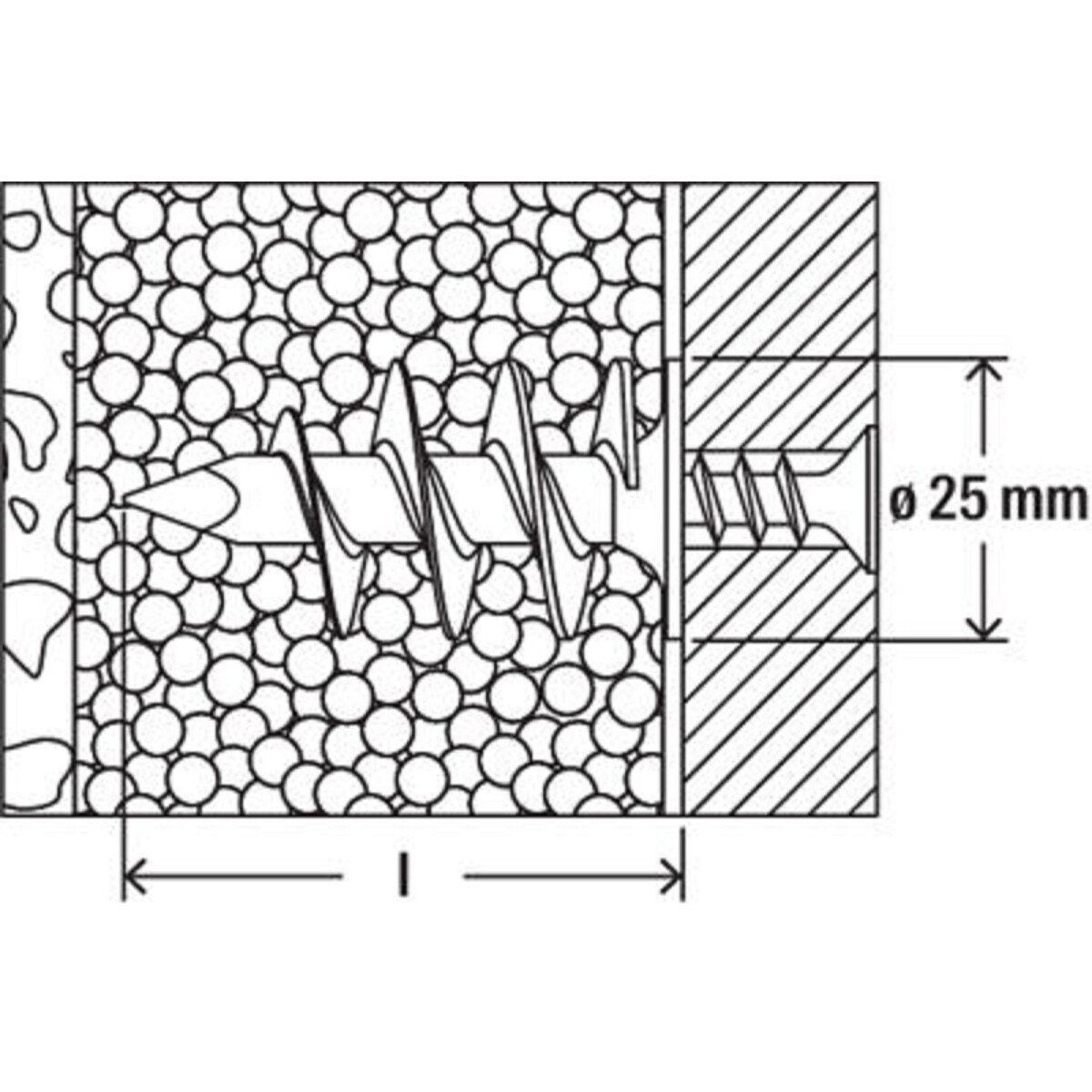 Technical Data Anchor length l 22 [mm] Min. thickness to first supporting layer t 25 [mm] Screw dimension ds x ls 4.0 - 5.0 x Ls [mm] Contents 90 x GK Green, 1 x setting tool Packaging Folding box Amount 90 [pcs.] GTIN (EAN-Code) 4048962199918 Applications Pictures Lighting Electrical installations Fitting accessories Series installations Building materials Gypsum plasterboard, single and double-planked