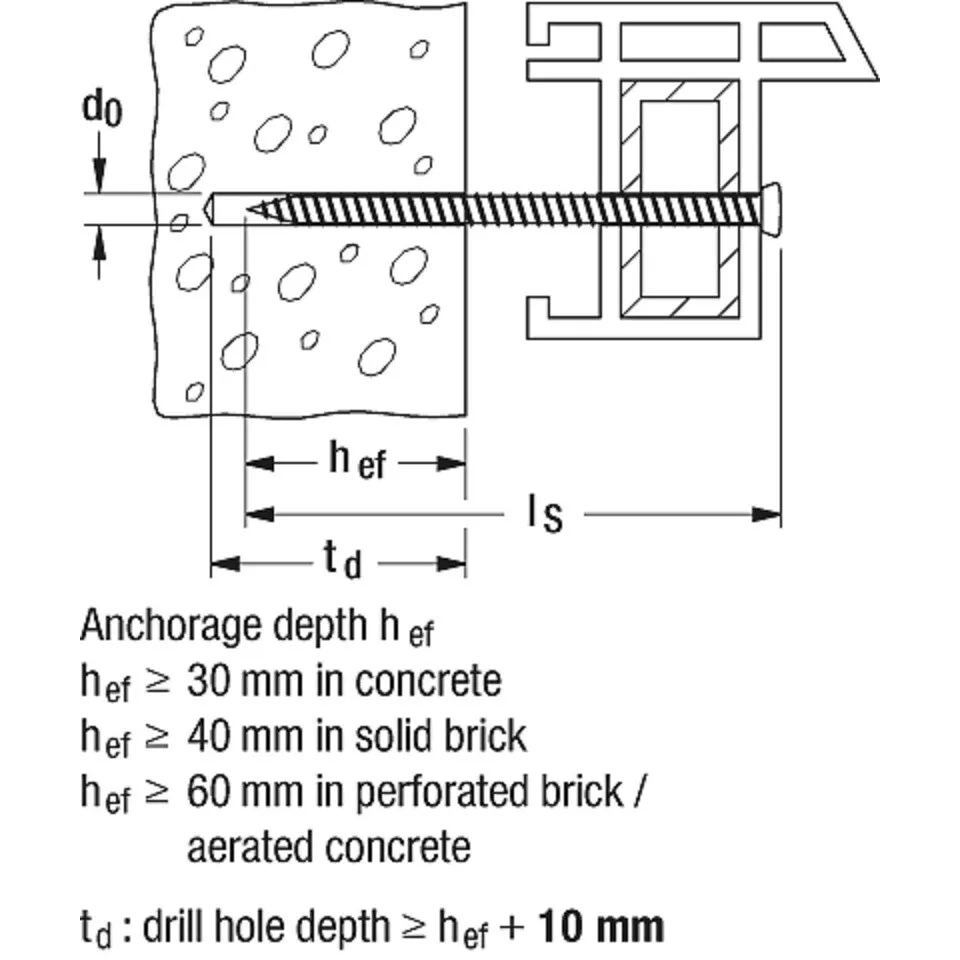 - Note the drill hole and screw-in depths for the different building materials listed in the table