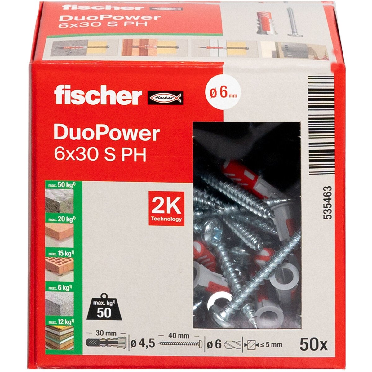 - The fischer DuoPower offers very good hold values as a result of its 2 components: Depending on the building material, the grey components made from high quality nylon automatically activates the optimum product function (expansion, folding, knotting) for the best hold