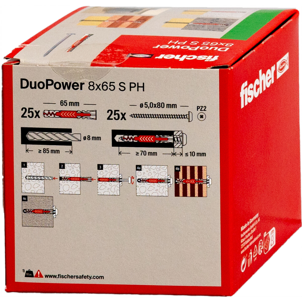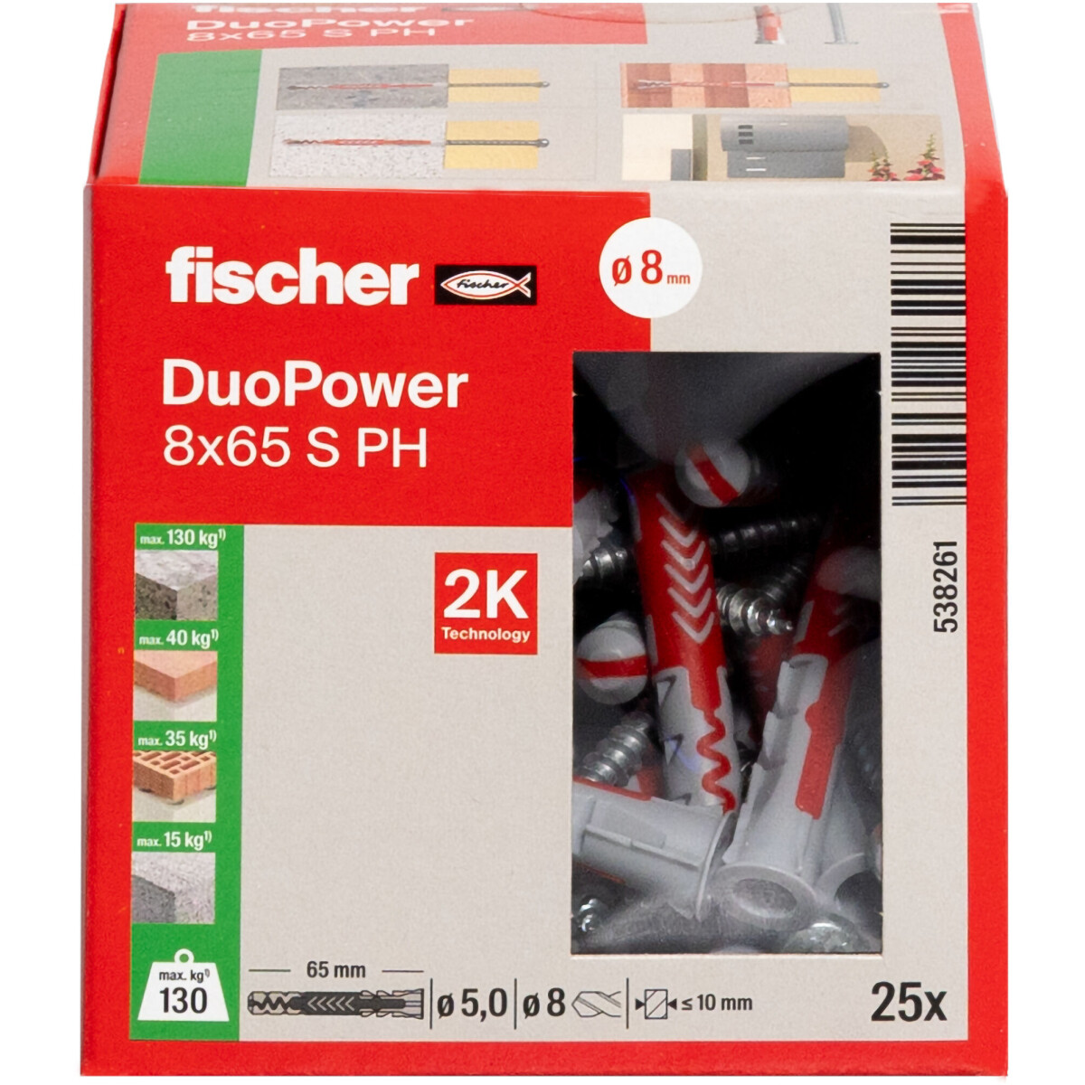 Drill diameter (d0) 8 mm Min. drill hole depth (h1) 85 mm Min. panel thickness (dp) 25 mm Anchor length (l) 65 mm Min. bolt penetration (lE,min) 70 mm Wood and chipboard screws (ds) 5.0 x 80 mm Drive PH2 Contents 25 x DuoPower 8 x 65 25 x Pan head screw 5.0 x 80 Amount 25 pcs Packaging Folding box GTIN (EAN-Code) 4048962262285