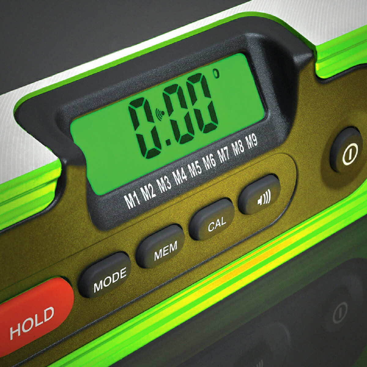 Easy-read LED screen inverts for use overhead and upside down and is supplemented by two-spirit level vials if needed.
