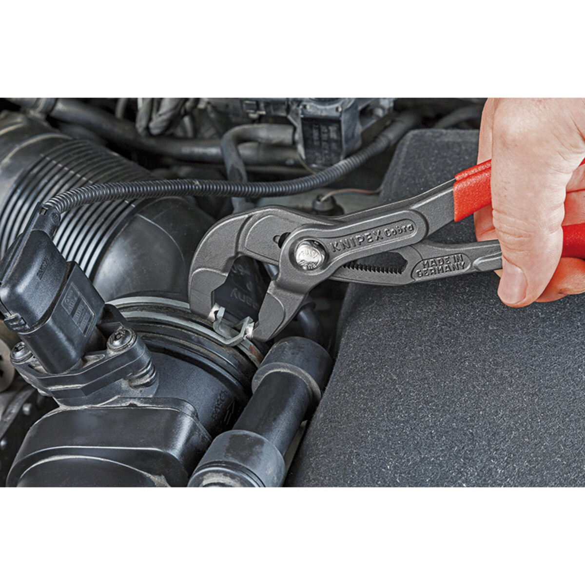 DetailsExpert Quality, exceptionally versatile hose clamp pliers fitted with rotating grip inserts. Used for removing spring band rings, standard or space saving clamps and simple spring wire hose clamps found in older vehicles and household appliances. The quick-set 25 position adjustment provides easy alteration for precise and repetitive working, useful when working with reinforced or very large spring band clamps. Display packed.