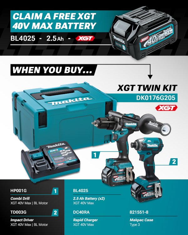This DK0176G205 40v XGT Twinkit contains the HP001G 40v Combi drill and TD003G 40v Impact driver with 2x 2.5Ah Batteries and Charger in a Makpac stacking case