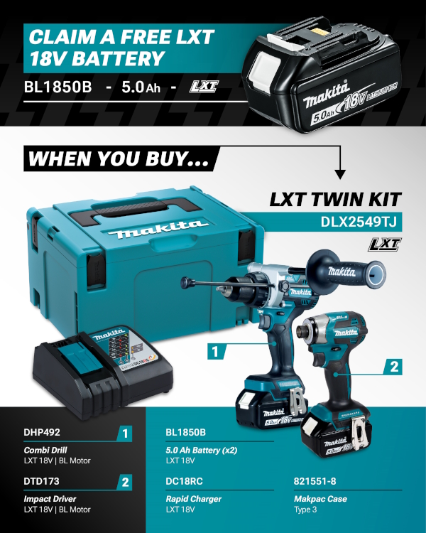 This DLX2549TJ 18V LXT Combi Kit contains the DHP492 Brushless Combi Drill and the DTD173Z Brushless Impact driver with 2x 18V - 5.0Ah Batteries and Charger in a Makpac Stacking Case