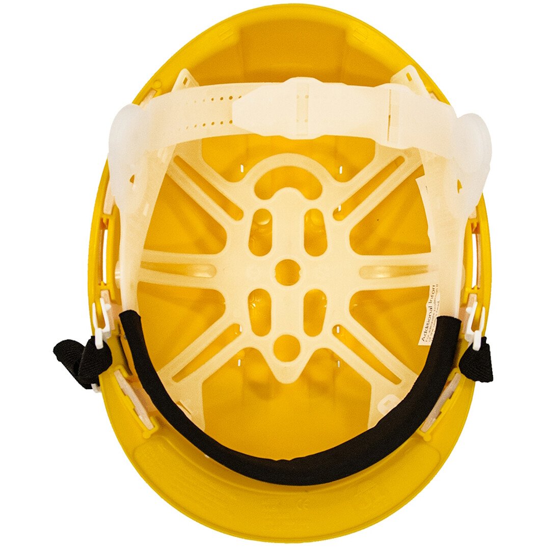 - 6-point plastic suspension harness for wearing comfort, safety and easy cleaning