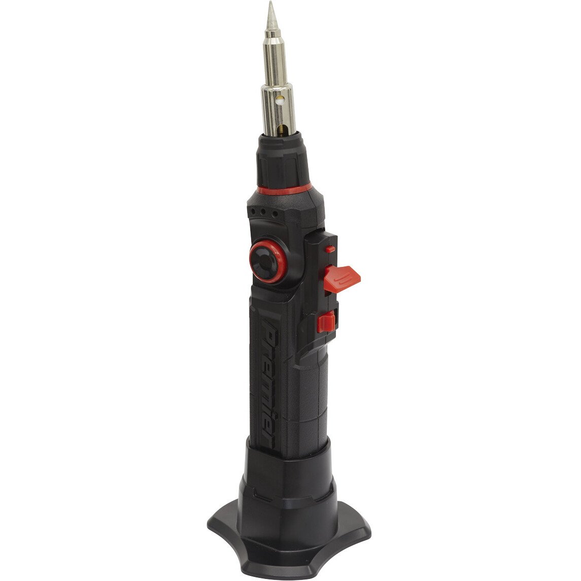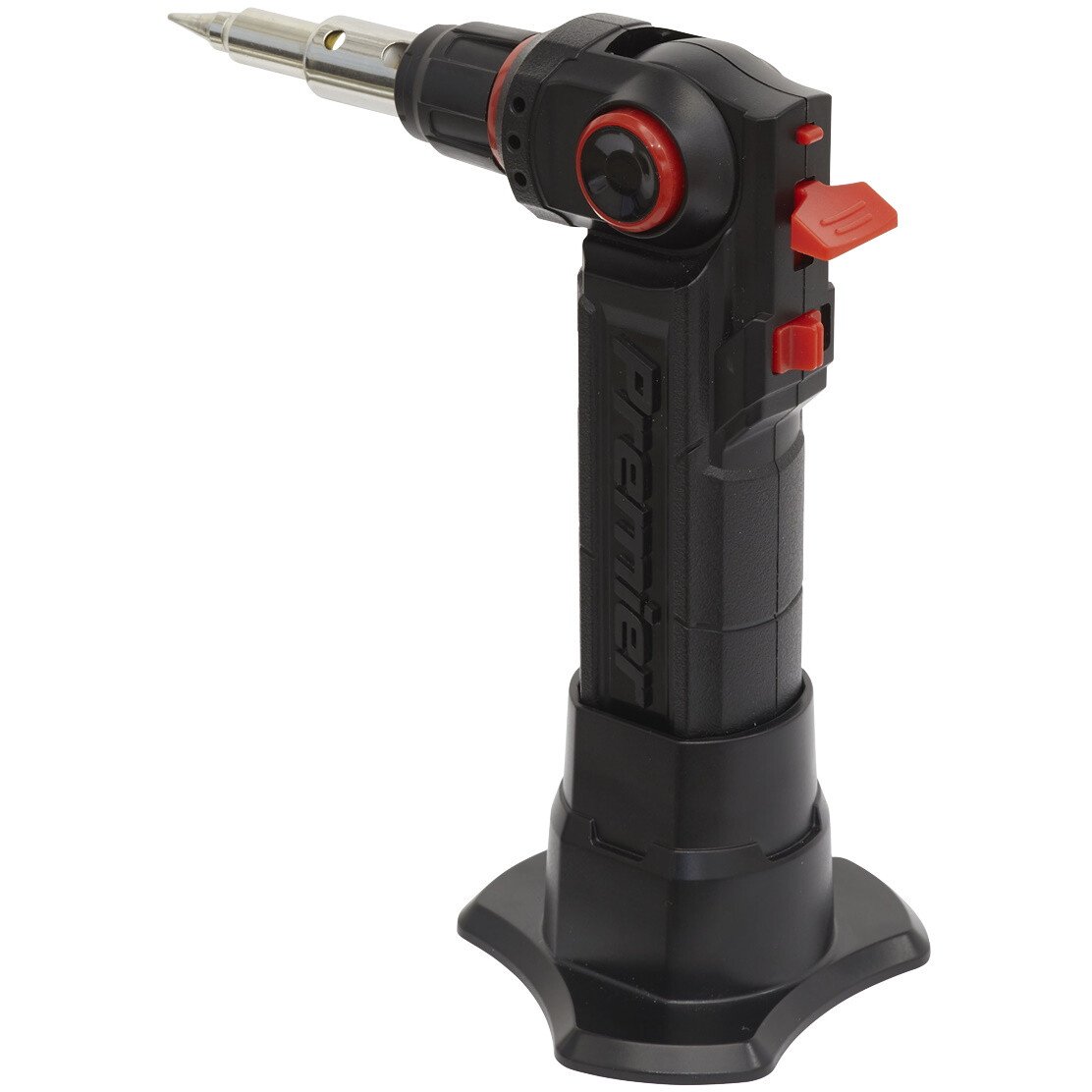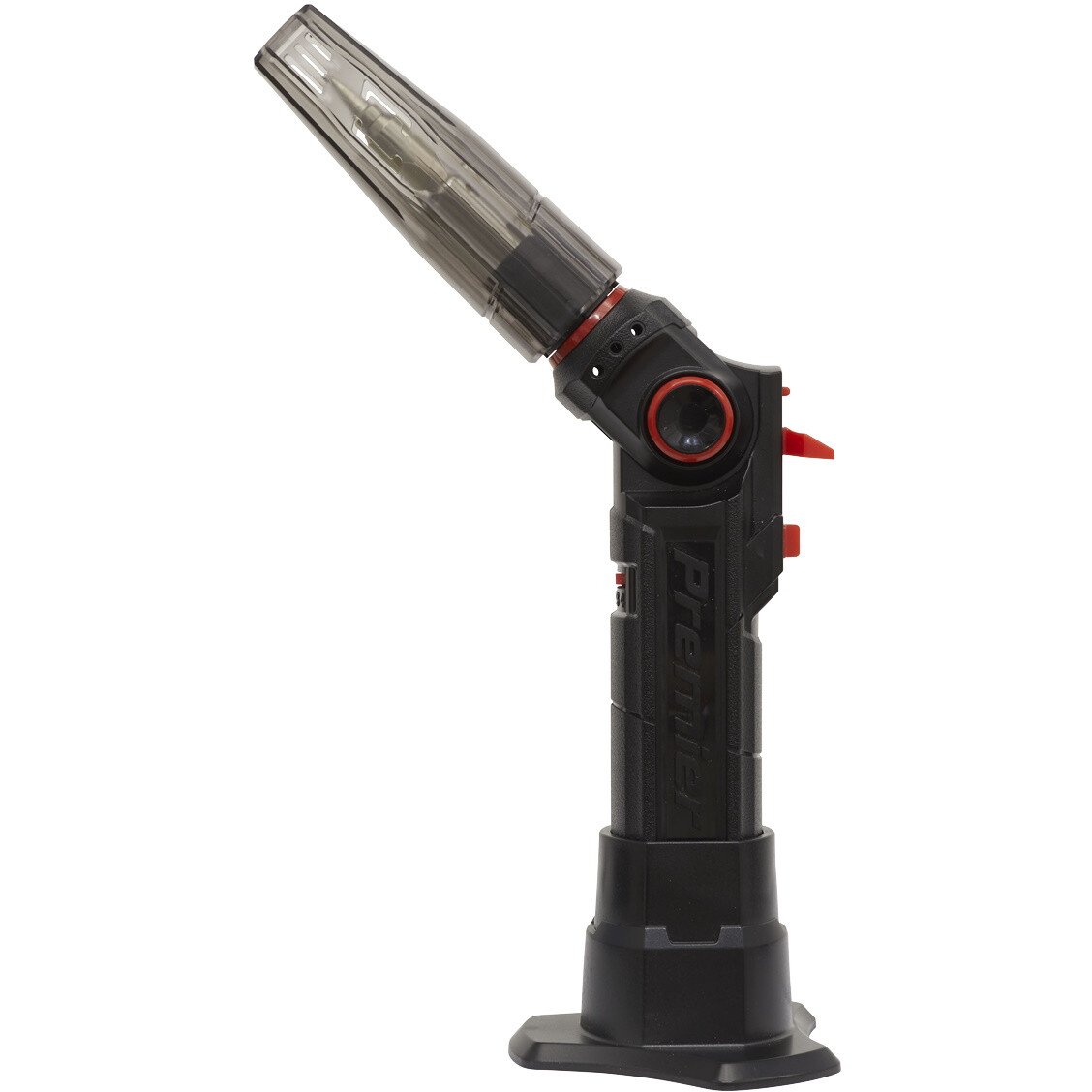 • Powered by butane (lighter fuel) and features a piezoelectric ignition switch.