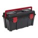 Strong composite toolbox with integral tote tray and small parts storage tray.