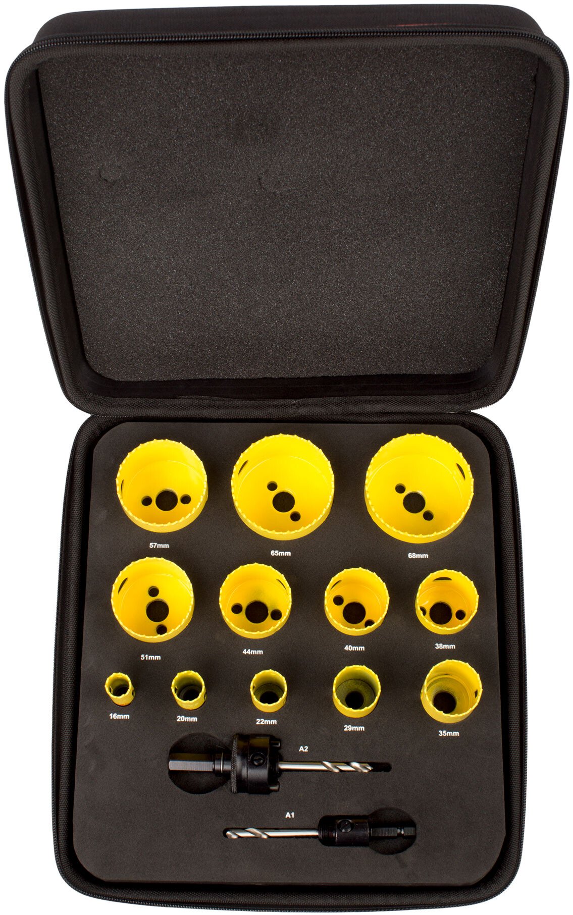 Kit comprises 16mm, 20mm, 22mm, 29mm, 35mm, 38mm, 40mm, 44mm, 51mm, 57mm, 65mm, 68mm. A1 & A2 Arbors.